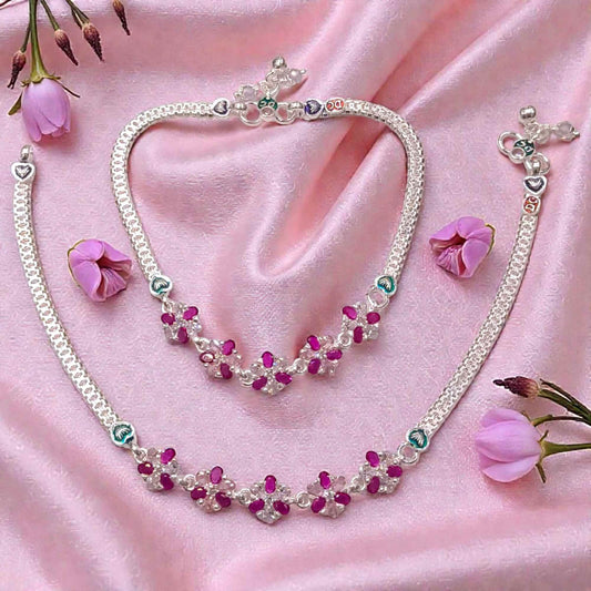 Premium Silver Payal with Pink CZ Stones for Women by Jauhari Jewellers
